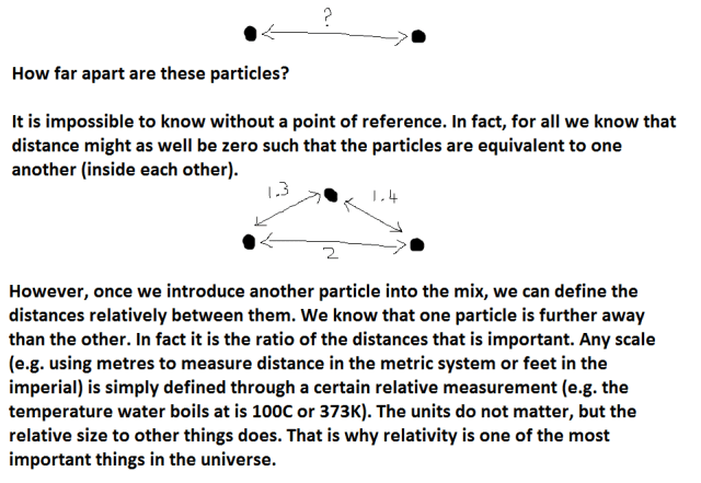 I believe explanation of the power of mathematics can be found through starting with the simple statement 0=0. The rules of algebra dictate that we may apply any transformation to either side as long as we apply it to the other. In the mathematical sense, we might add 2 to either side to give 2=2. But this could also be written 1+1=2. I firmly subscribe to the belief that every action has an equal and opposite reaction is an underlying principle in the creation of the universe. If something is created, its equal and opposite must also be created. Through various transformations things might appear not to sum to 0 in the universe: there are a growing multitude of different physical phenomena that we must look at and consider in describing the universe. Yet, I believe that if all things are reduced to their simplest form – rearranging the equation – this will not result in a solvable equation with universal variables, but a simple statement that can be reduced to 0=0. Of course you would have to \”solve simultaneous equations on a grand scale\” to achieve this, but in doing so would better understand the patterns of the universe. I think that you must think of forces, energy, fields etc. to all be intrinsically linked and to be of the same sort of substance (i.e. things which exist in this universe the traditional sense) in order for this to be possible, however the universe as we know it is such a complicated soup of all these things that it becomes difficult, almost impossible, to make sense of it in this fashion. I also believe that relativity arises from everything having an equal and opposite as shown by the diagram below, which I shall leave for the reader to consider: